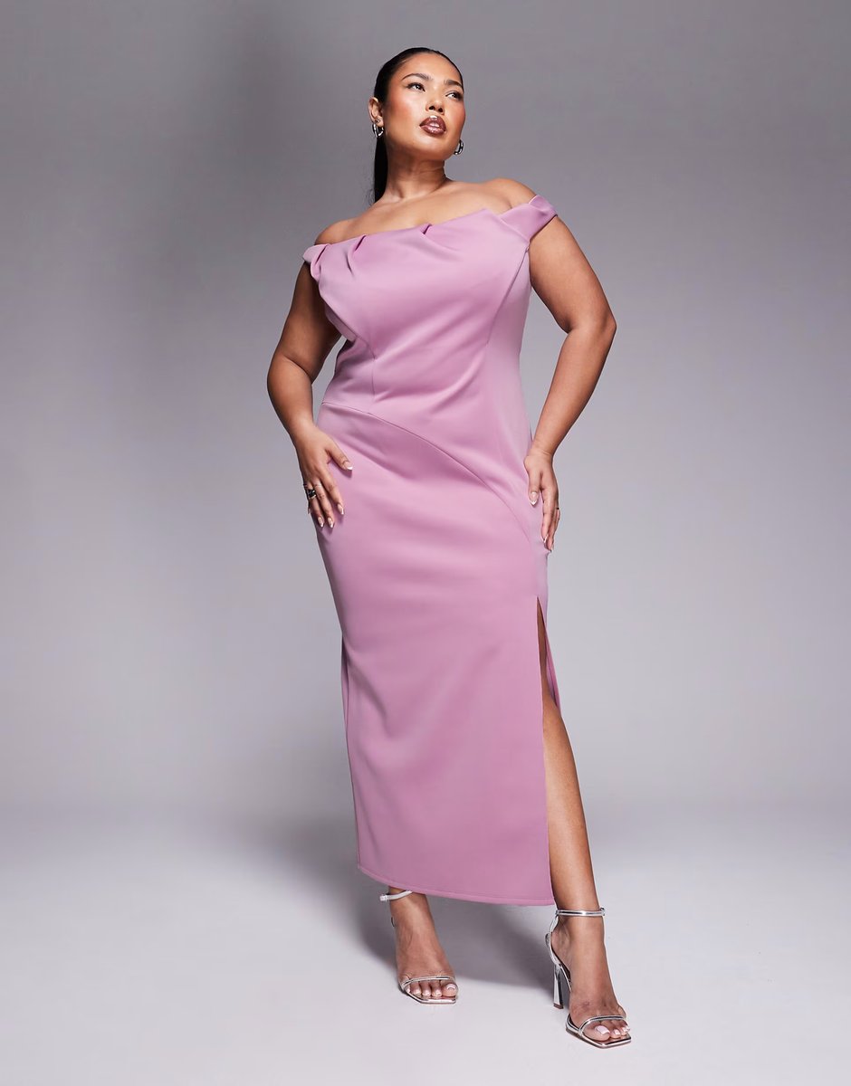 The ASOS Off-Shoulder Pleated Maxi Dress in Rose is ideal for evening, party.