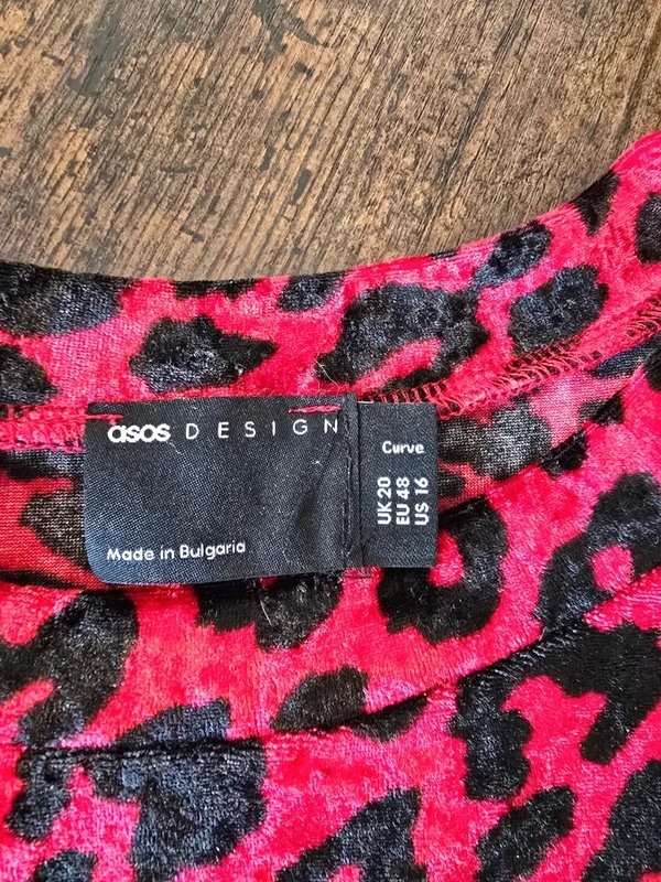 This bold red and black leopard print dress from ASOS Design Curve is crafted from soft velour-style fabric, providing a comfortable and flattering fit. Perfect for evenings or special occasions.