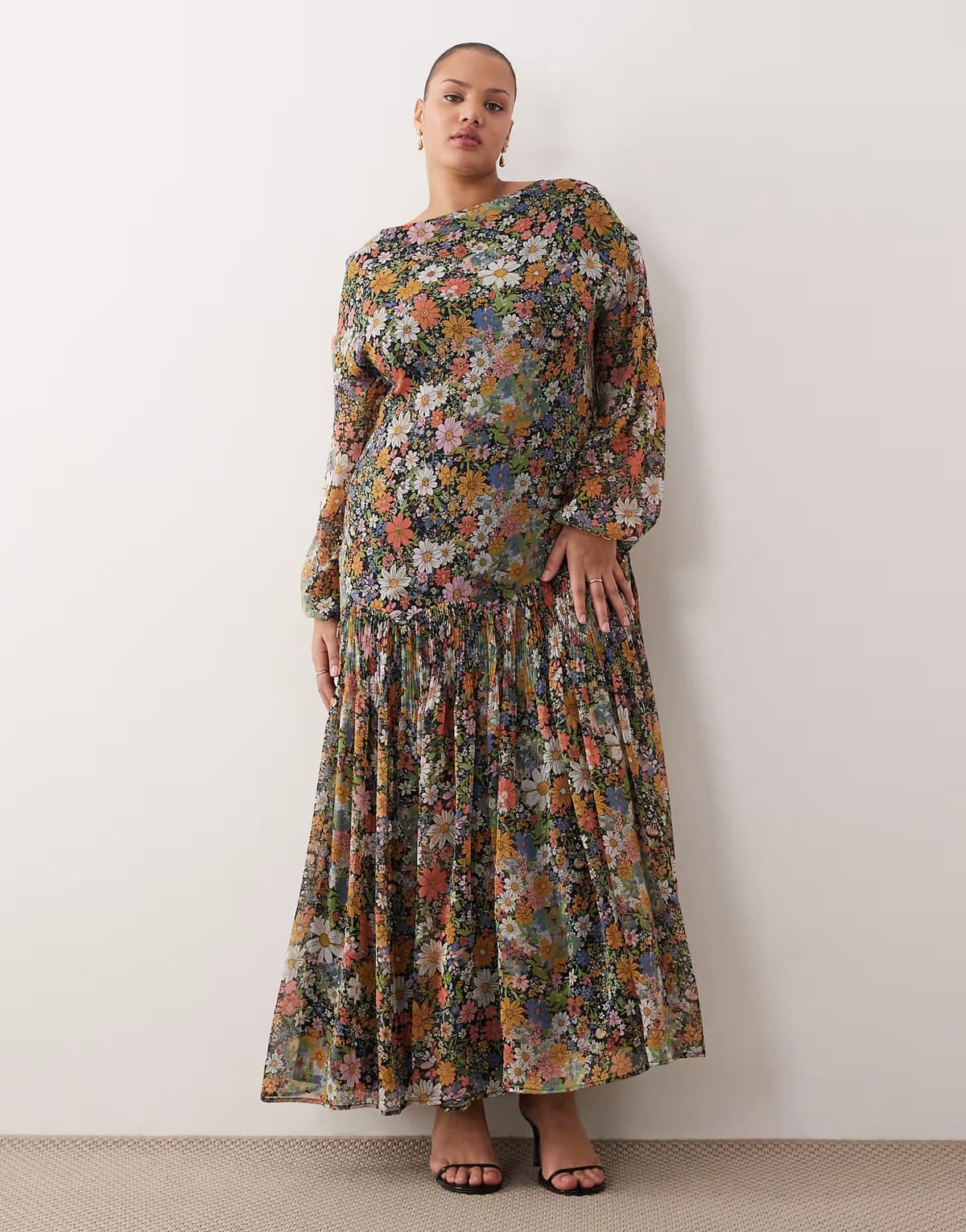 This ASOS maxi dress features a floral print with a slash neckline and long sleeves. The full skirt adds volume and movement, perfect for a bohemian look.