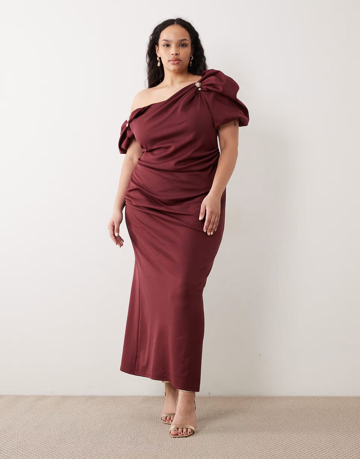 The ASOS Curve Puff Sleeve Midi Dress in Berry is made from satin.