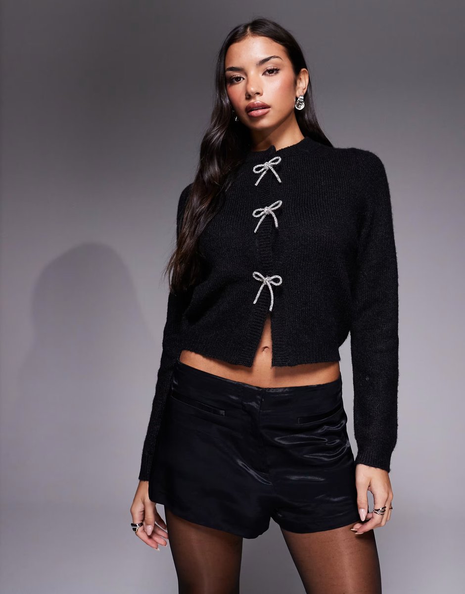 The ASOS DESIGN Diamante Bow Front Cardigan in Black is ideal for party.