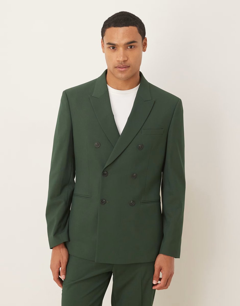 The ASOS Double Breasted Slim Suit Jacket in Dark Green is ideal for business, formal.