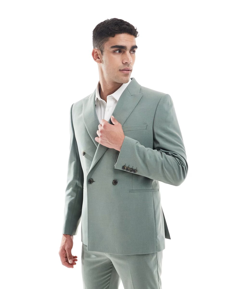 The ASOS Double Breasted Slim Suit Jacket in Green is ideal for work, business.