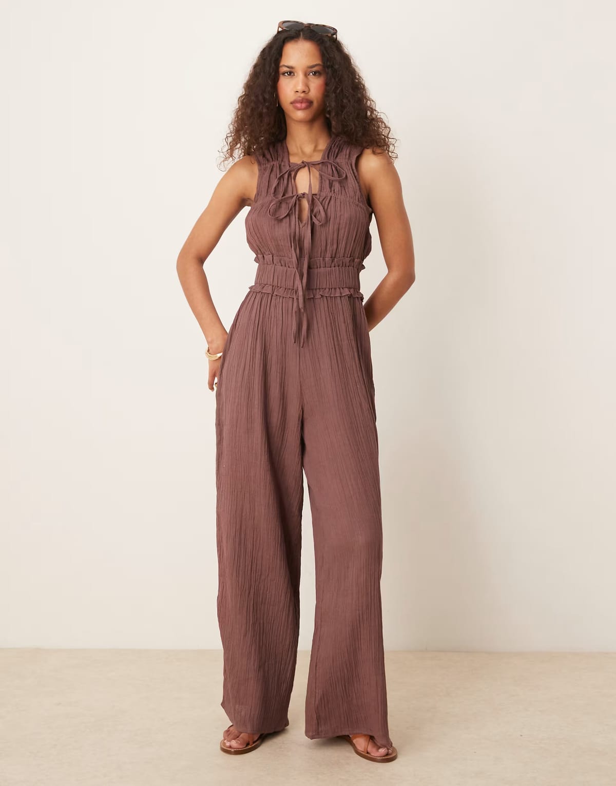 Stylish chocolate brown jumpsuit with a gathered bust and adjustable drawstrings at the neckline and waist. Made from double cloth fabric for a lightweight and slightly crinkled texture. Perfect for a casual yet chic look.