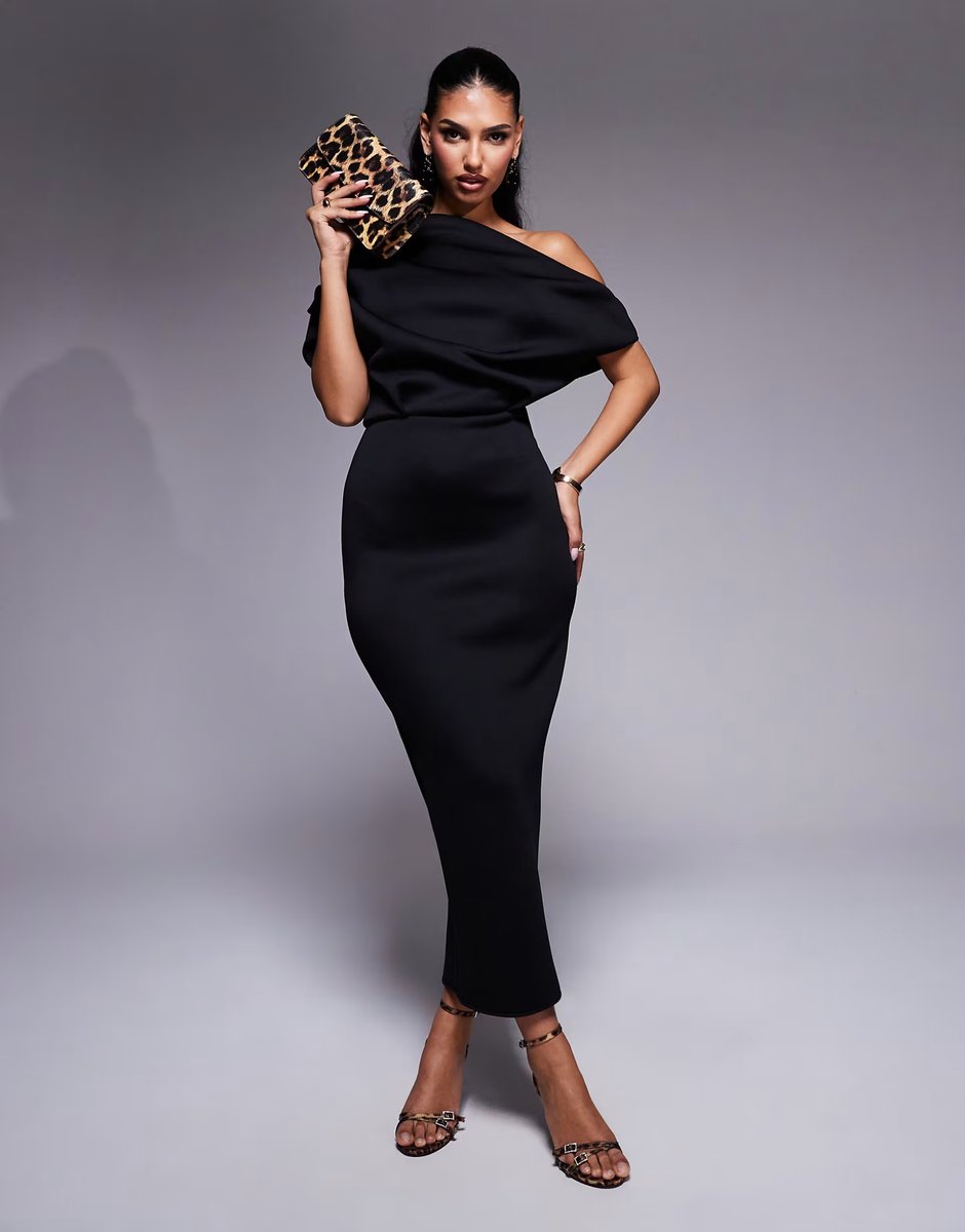 The ASOS Dramatic Neckline Midi Dress in Black Scuba-Style Fabric is ideal for evening, special-occasions, formal.