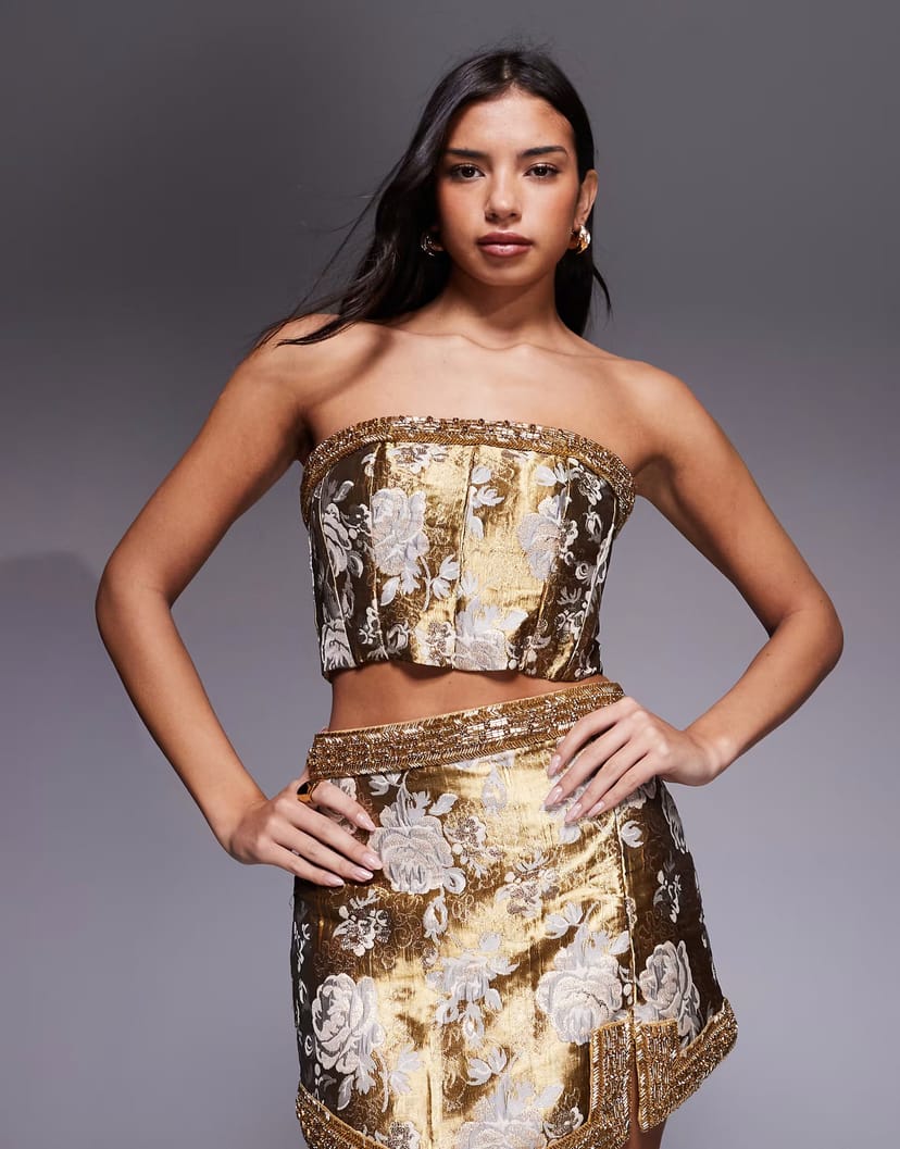 This gold jacquard embellished bandeau co-ord top by ASOS DESIGN features a corset-style bandeau with a floral pattern and sequin embellishments. Paired with a matching mini skirt, this set is perfect for evening events or special occasions.