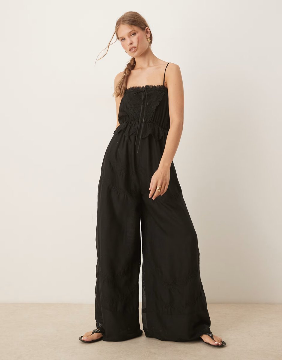 The ASOS Embroidered Cami Jumpsuit with Ribbon Detail in Black is ideal for evening, casual.