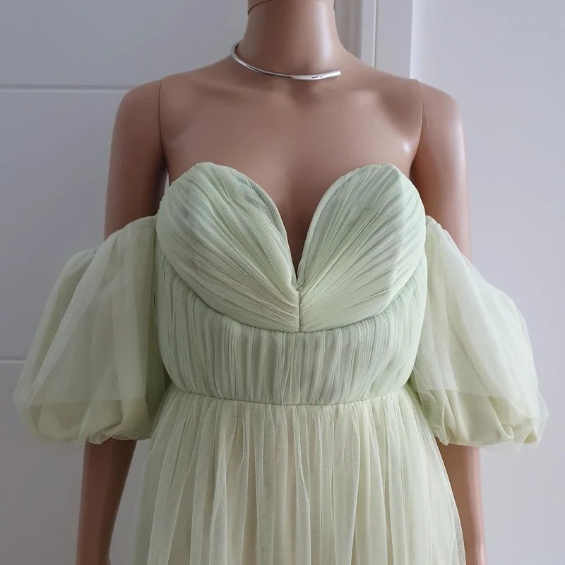 Crafted with sage green tulle, this off-shoulder cocktail party gown features ruffled tiered details and puffy sleeves, perfect for special occasions.