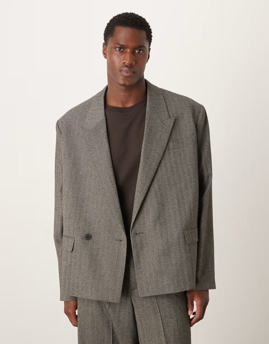 The ASOS DESIGN Oversized Grey Herringbone Suit Jacket is available in sizes XXXL, XXL, XL, XS, L, M, S.
