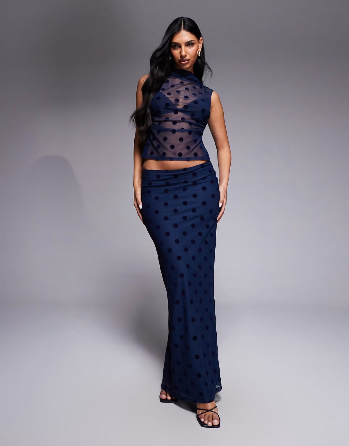 See all outfit ideasThis ASOS co-ord set features a navy spot flocked mesh top and a maxi skirt with a polka dot pattern. Perfect for evening events or parties.