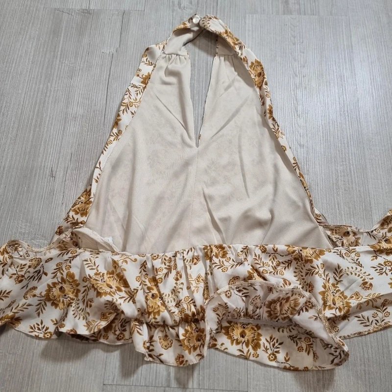 This floral print, cropped halterneck top exudes boho elegance with its ruffled hem. Perfect for a touch of summer allure in your trendy wardrobe.