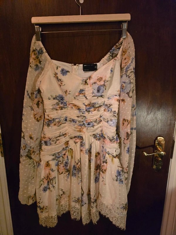 Turn heads in this dreamy ASOS mini dress, featuring ruched detailing, puffed long sleeves, and delicate lace trim at the hem. Perfect for weddings, garden parties, or any summer occasion.
