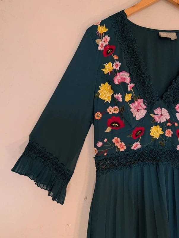 The ASOS Floral Embroidered Dress in Dark Green is available in sizes L.
