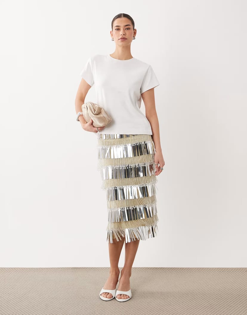 The ASOS DESIGN Silver Fringe Embellished Midi Skirt is ideal for evening, night out, casual.