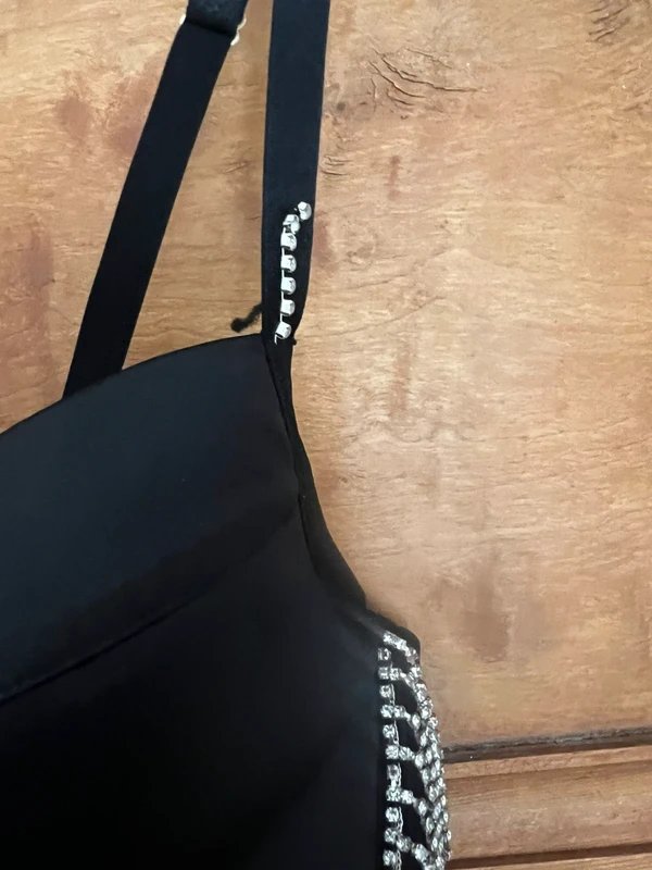 This stunning black bodysuit from ASOS boasts a luxe satin & mesh mix and dramatic diamante fringe detailing. The underwired cups provide flattering bust support, making it perfect for a statement night-out look.