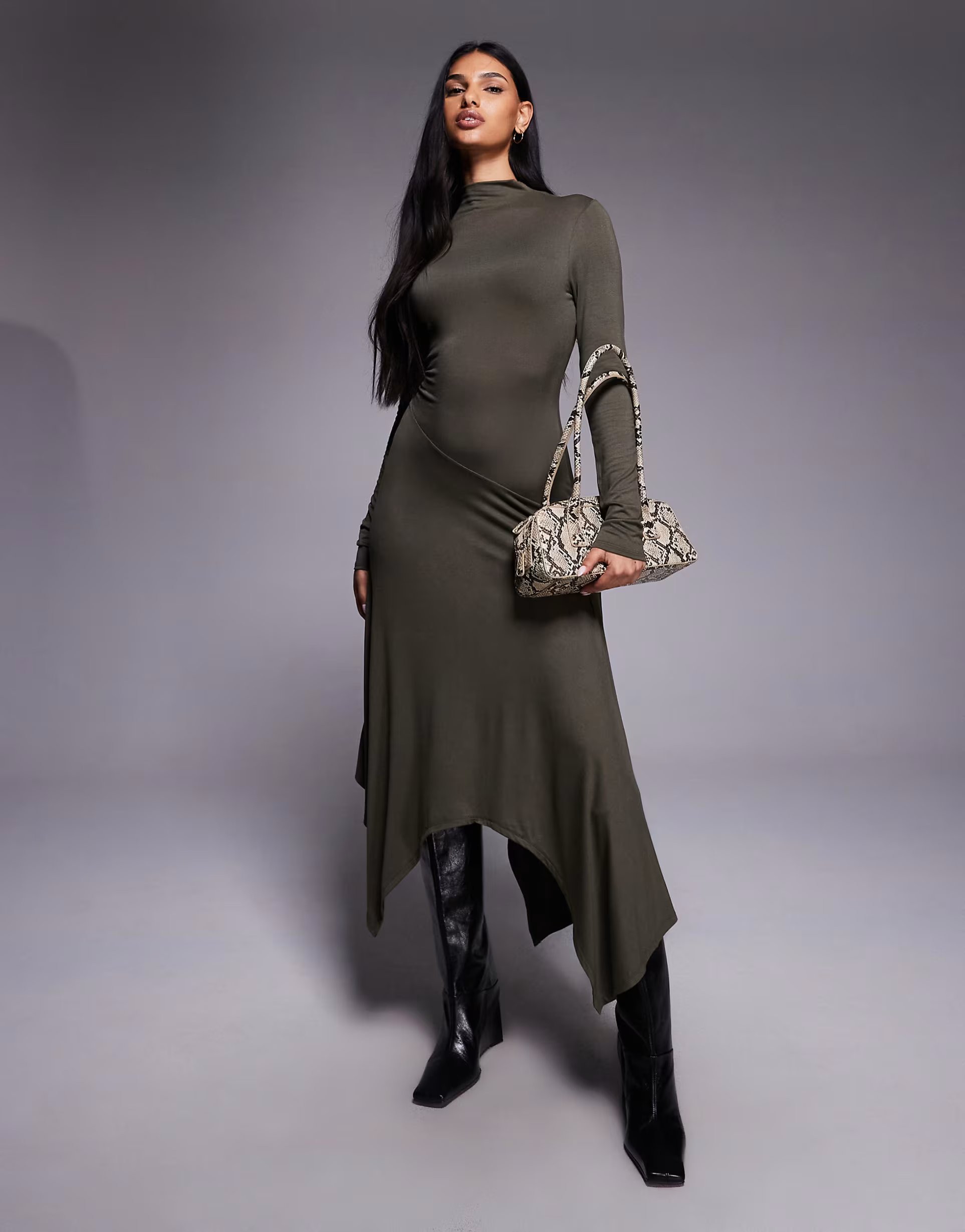 The ASOS DESIGN funnel neck hanky hem midi dress in khaki is a stylish and versatile piece. Featuring a funnel neck, hanky hem, and midi length, it's perfect for both casual and semi-formal occasions.