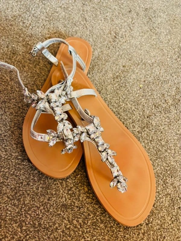Elegant silver sandals adorned with sparkling crystals. Perfect for special occasions with their dazzling design.