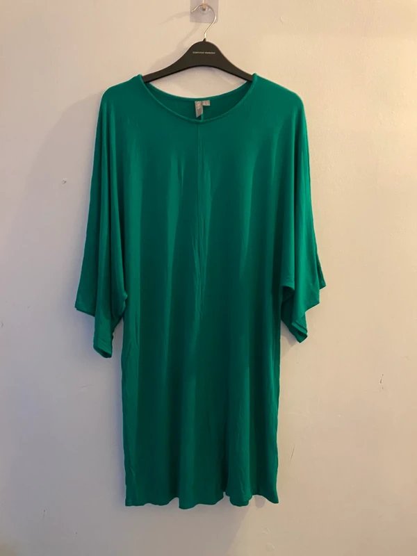 The green, wide sleeved, oversized jersey t-shirt dress adds a vibrant touch to your wardrobe. Perfect for casual outings or lounging.