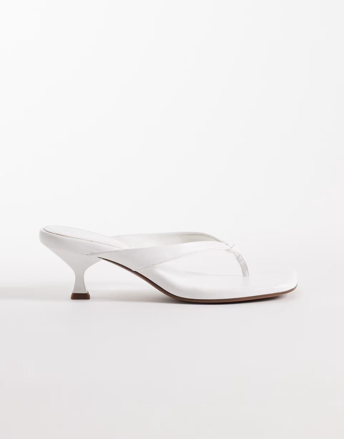These white thong kitten heel sandals from ASOS are perfect for adding a touch of elegance to your summer wardrobe. Crafted with a thong strap and a pointed toe, they offer a chic and sophisticated look suitable for any casual occasion.