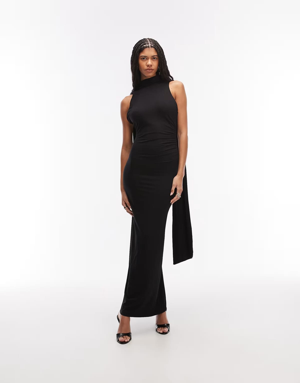 The ASOS DESIGN High Neck Backless Maxi Dress in Black is made from polyester, spandex.