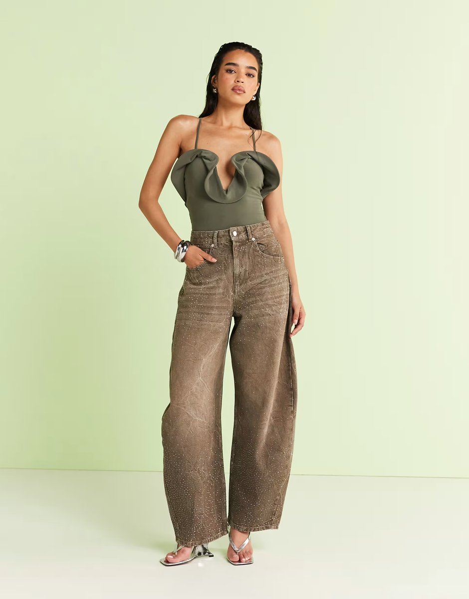 Lightweight khaki high-waisted barrel jeans featuring diamante embellishments. Crafted from a blend of cotton and polyester for a comfortable fit, these jeans have a distressed look with sparkling accents that add a touch of glamour. Perfect for casual outings, weekend parties, or daytime events. • Brand: ASOS DESIGN • Barrel leg style detailing • Distressed look with diamante embellishments • Materials: cotton, polyester • Fit: high-waisted • Ideal for: casual outings, weekend parties, daytime events