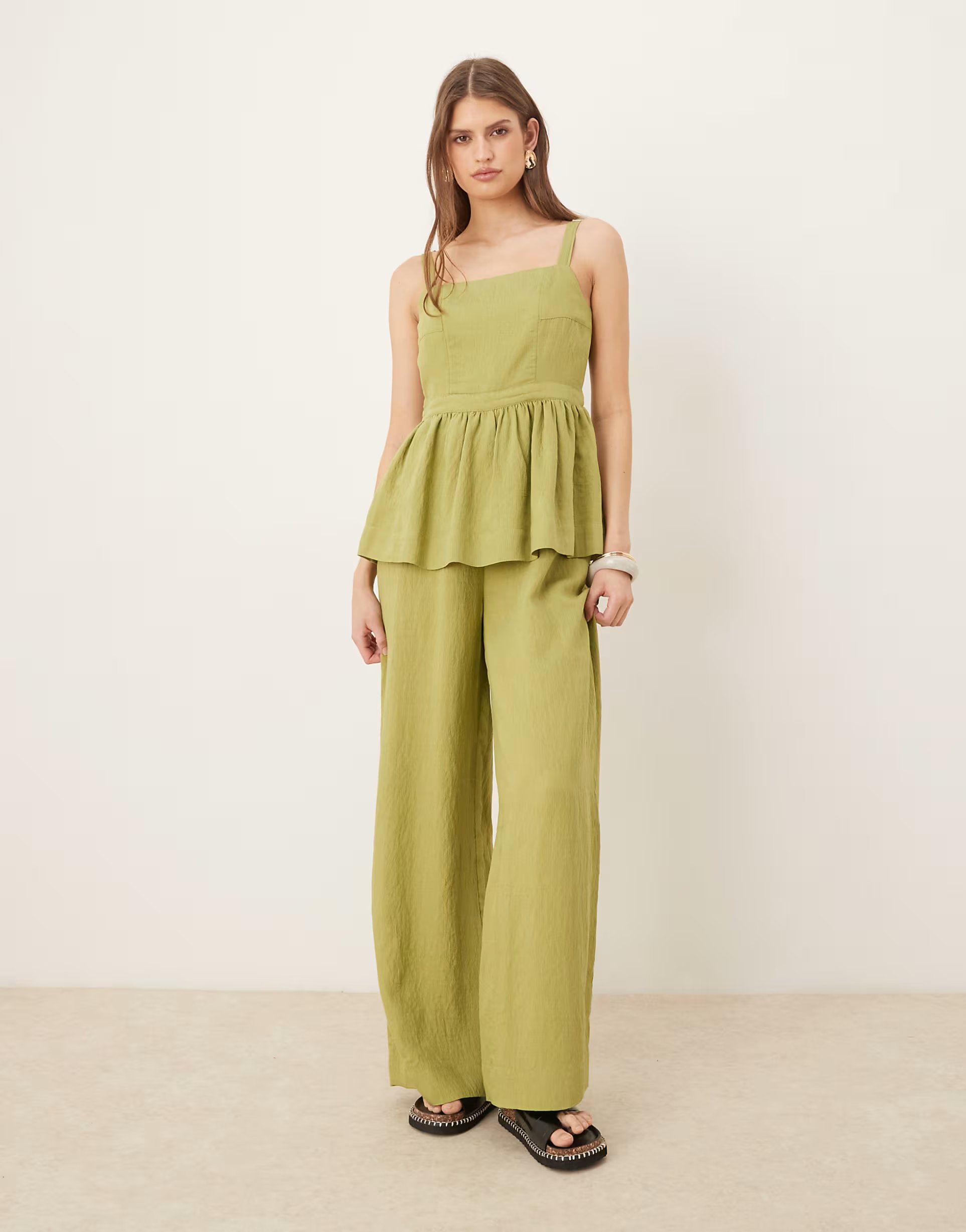 The ASOS DESIGN jumpsuit with peplum waist in olive green offers a stylish and flattering silhouette. The adjustable shoulder straps and high-waisted design accentuate the waist, while the wide-leg pants provide comfort and ease of movement.