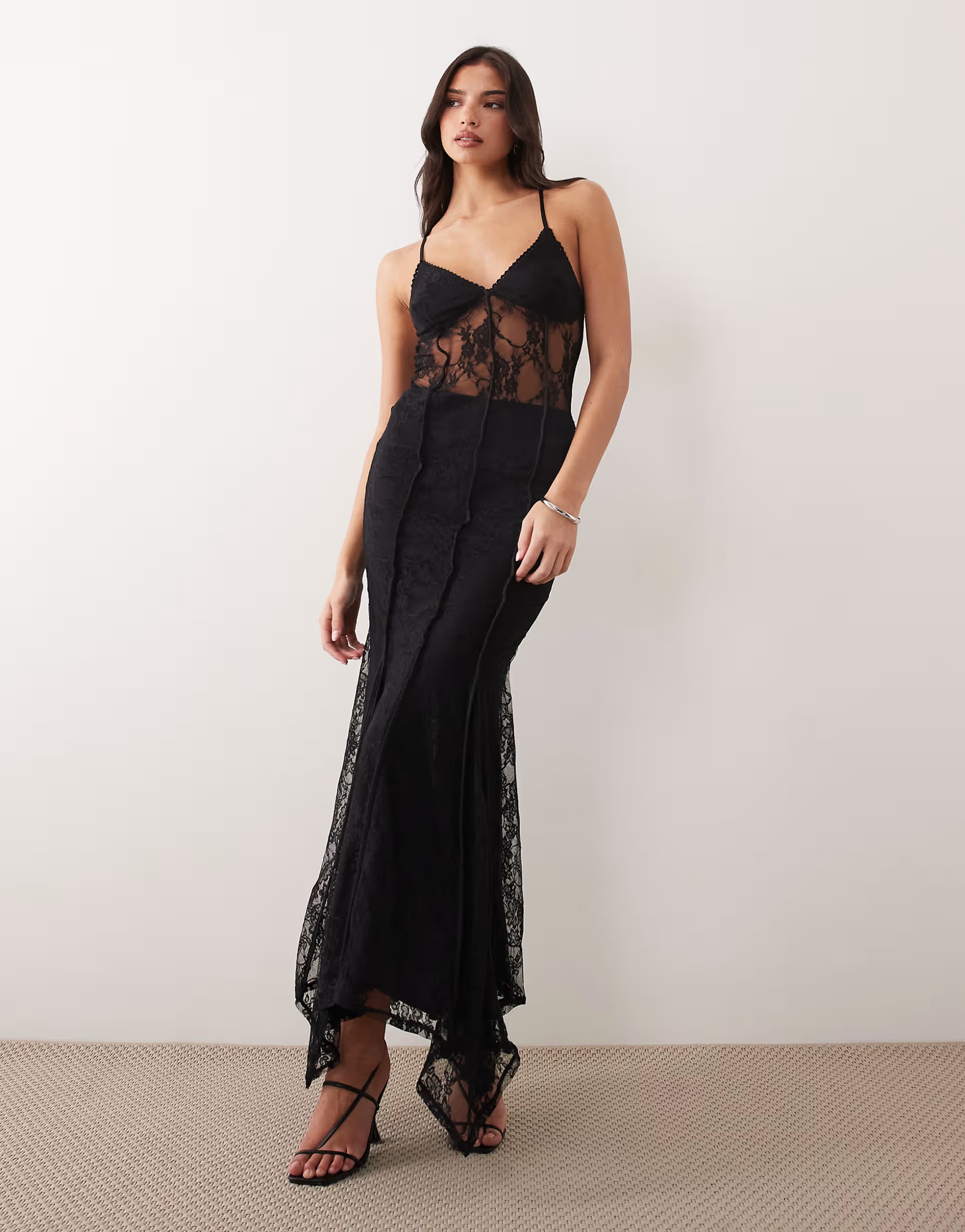 The ASOS Lace Cami Maxi Dress with Godet Hem in Black is ideal for evening.