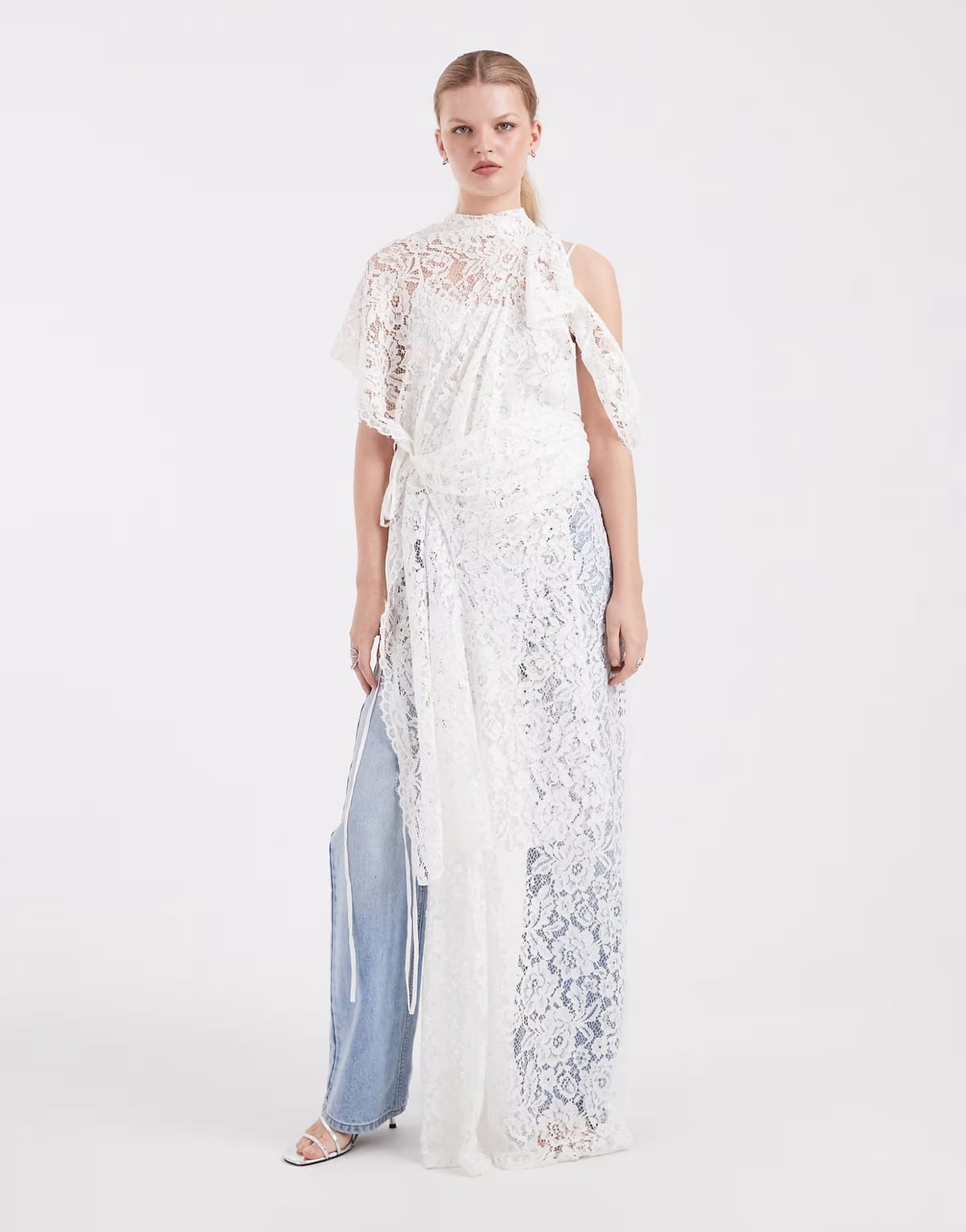 The ASOS Lace High Neck Maxi Dress in Ecru is made from lace.