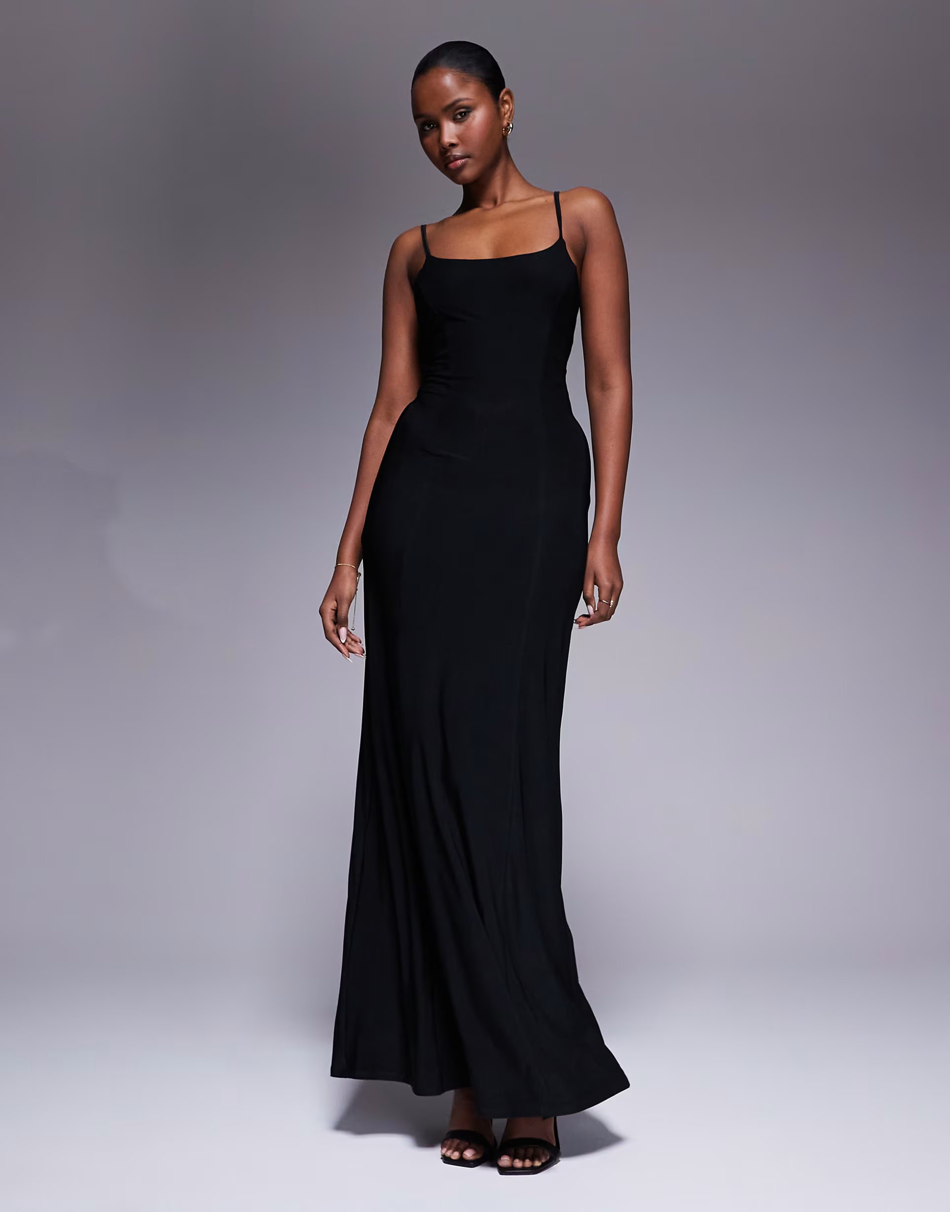 The ASOS Elegant Lace-Up Maxi Slip Dress in Black is made from stretchy fabric.