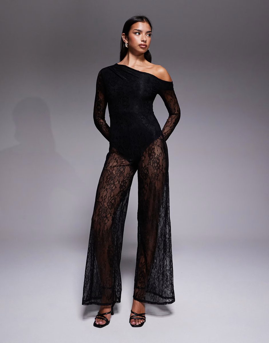 The ASOS Lace Wide-Legged Jumpsuit with Bodysuit Lining in Black is ideal for evening, party.