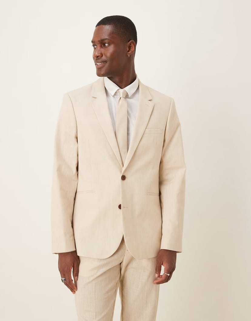 The ASOS DESIGN Linen Look Slim Suit Jacket in Stone is available in sizes XXXL, XXL, XL, XS, L, M, S.