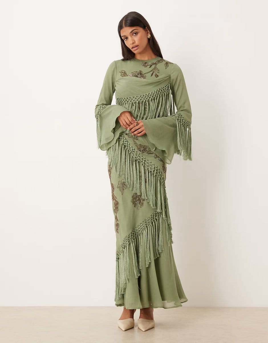 Green Long Sleeve Floral Embellished Maxi Dress — the ultimate statement piece for evening events and weddings. Designed in light khaki, this maxi dress showcases floral embellishments and draped fringing for a striking finish. Crafted from lightweight chiffon with intricate floral designs, it adds a touch of elegance and drama. Ideal for special occasions, it creates a mesmerizing effect as you move.