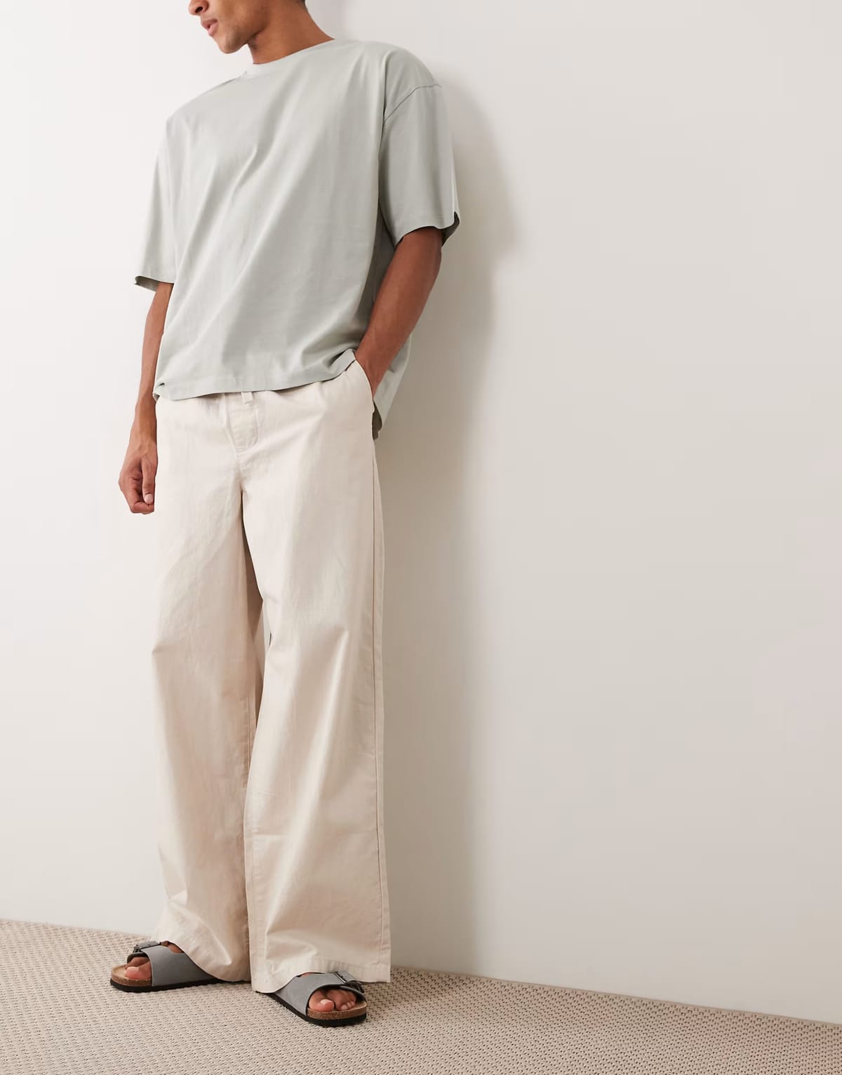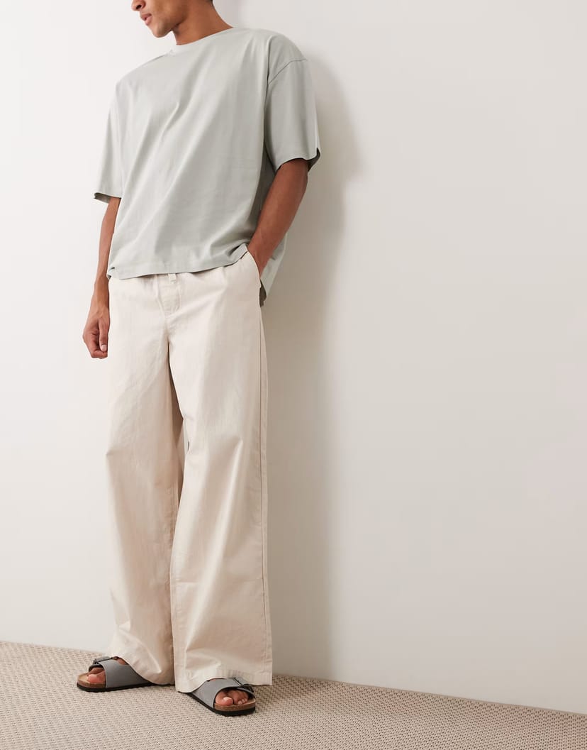 Casual ASOS loose linen blend trousers in stone featuring a relaxed fit and straight-leg silhouette. Ideal for a laid-back, everyday look.