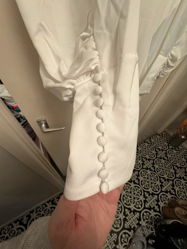 The ASOS Satin Wedding Dress with Puff Sleeves in Ivory is made from satin.