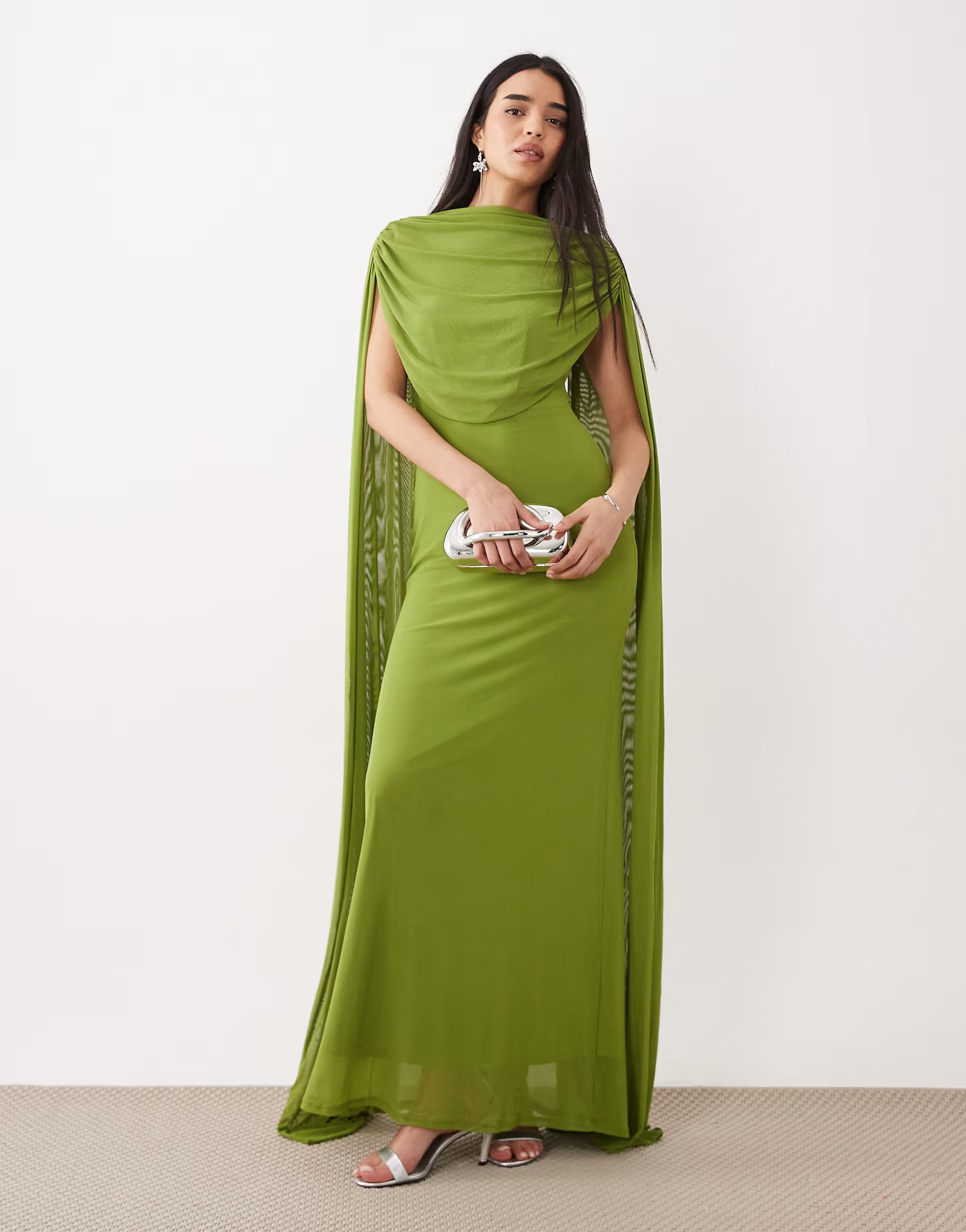 The ASOS DESIGN mesh cape draped maxi dress in green is perfect for those who love a bold statement. The sheer mesh fabric adds a touch of sophistication while the draped cape adds an elegant flair.