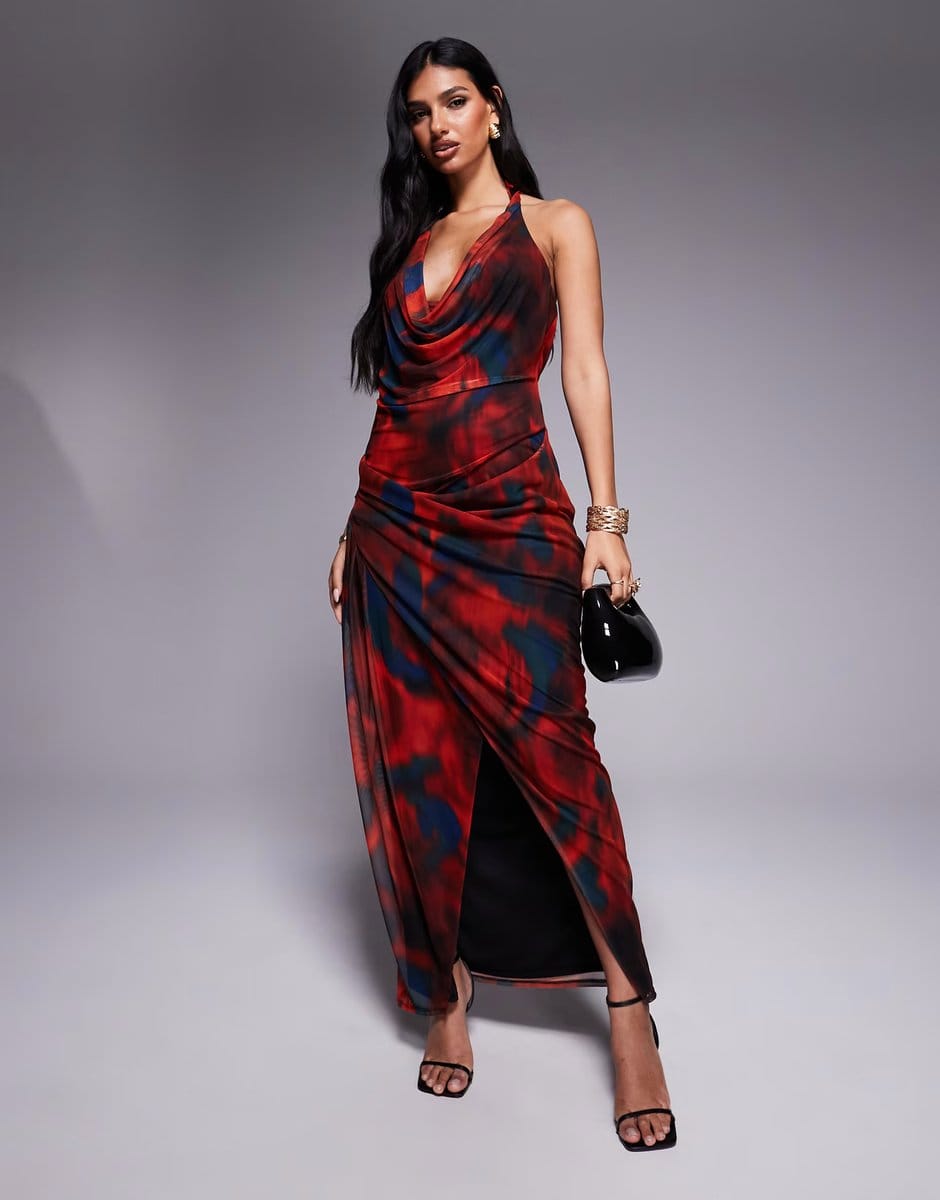 The ASOS Mesh Plunge Halter Midi Dress in Abstract Red and Blue is ideal for party, evening.