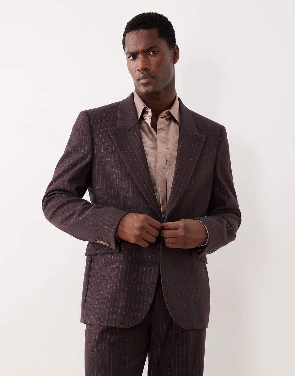 The ASOS DESIGN Metallic Pinstripe Slim Suit Jacket in Brown is available in sizes XXXL, XXL, XL, XS, L, M, S.