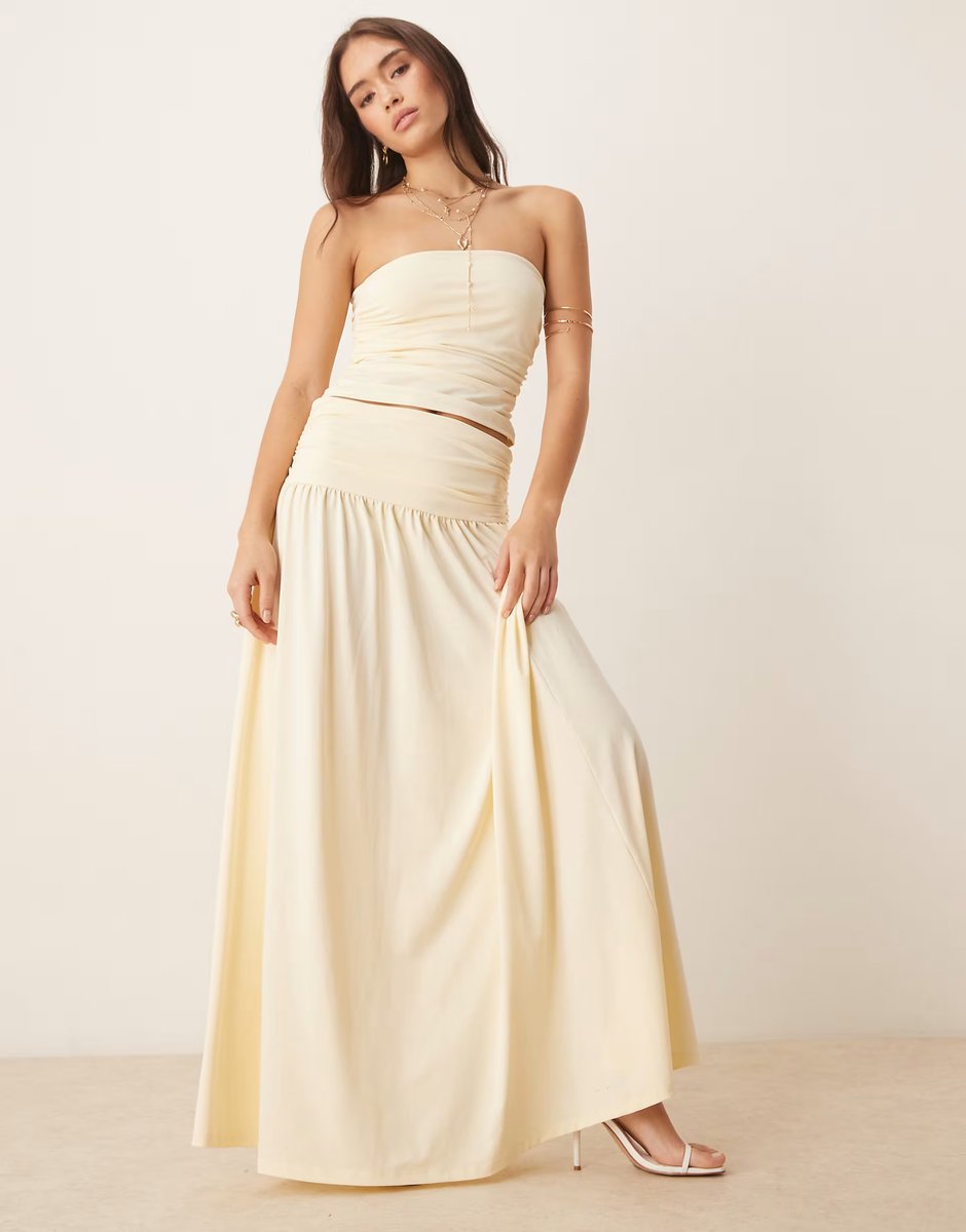 The ASOS Elegant Drop Waist Ruche Maxi Skirt in Buttermilk is ideal for evening, casual, date-night.
