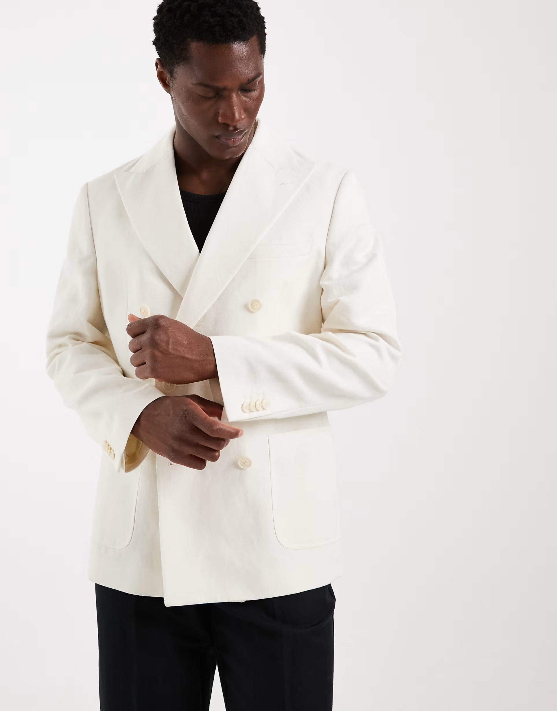 The ASOS DESIGN Double-Breasted Slim Suit Jacket in Cream is made from linen.