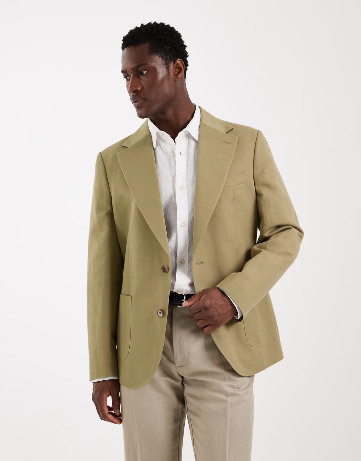 The ASOS Olive Linen Slim Suit Jacket is made from linen.