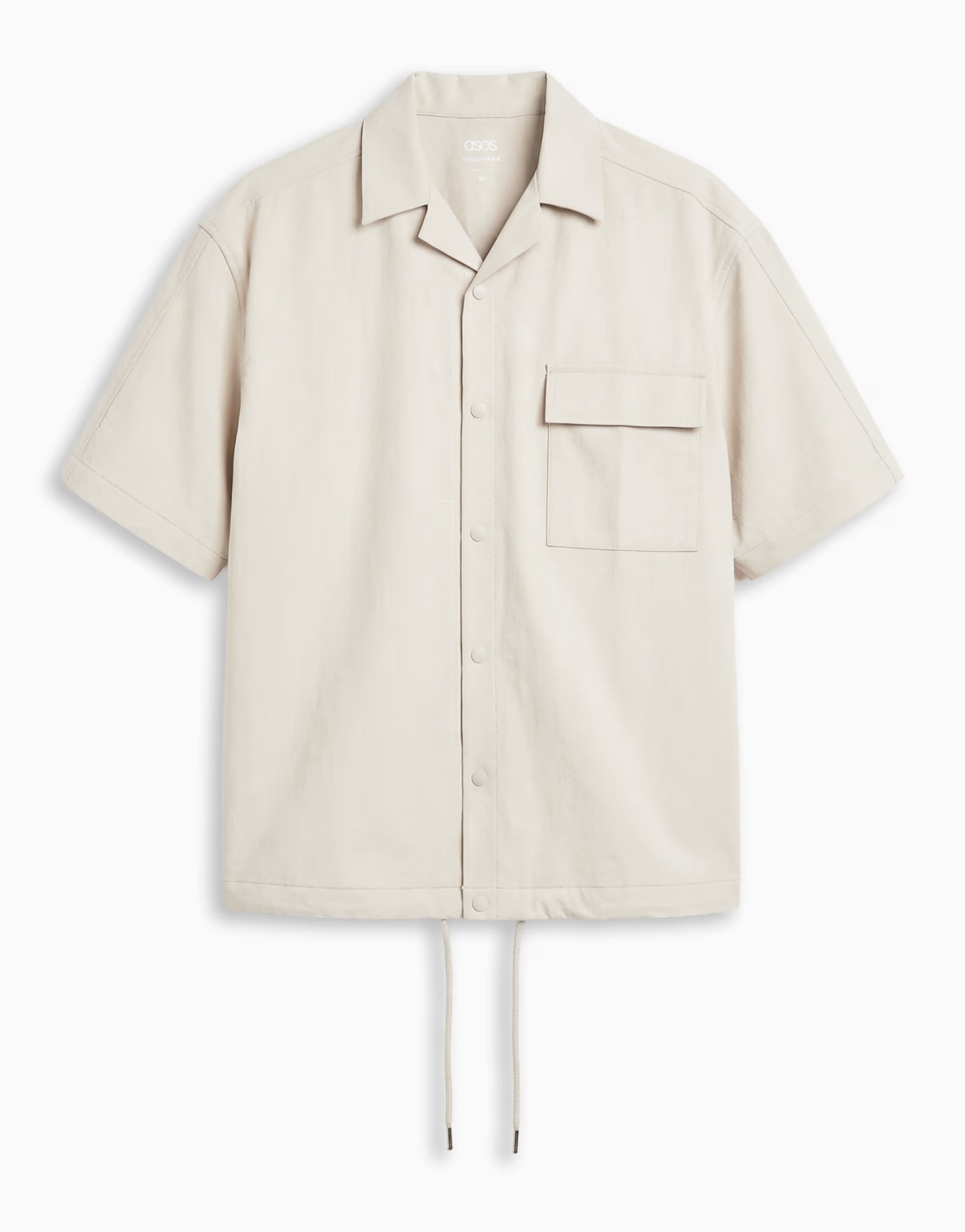 The ASOS Oversized Stretch Shirt in Beige is made from four-way stretch fabric.