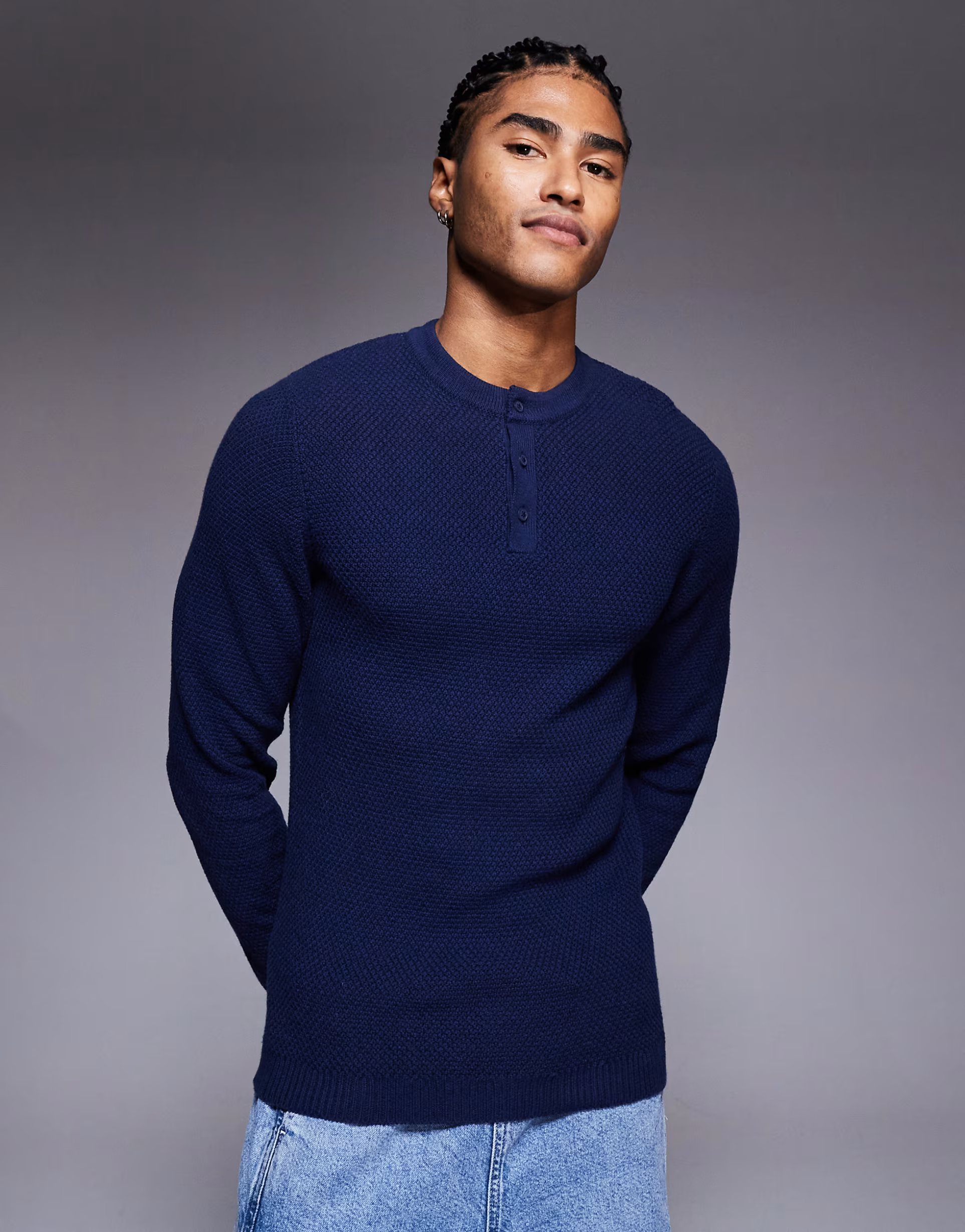 The ASOS DESIGN Navy Muscle Fit Knitted Henley Neck Jumper is available in sizes XXXL, XXL, XL, XS, L, M, S.