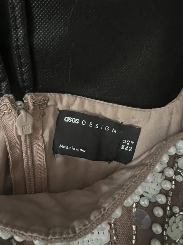 The ASOS Design Nude Denim Mini Dress with Sequins is available in sizes M.