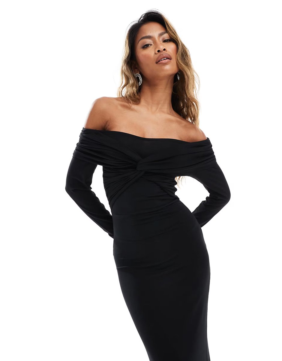 The ASOS DESIGN Off Shoulder Twist Midi Dress in Black is ideal for evening, party, formal.