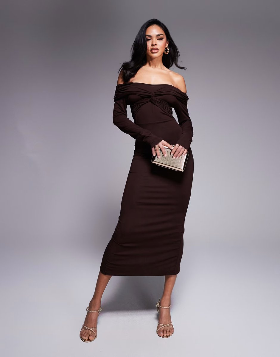 The ASOS DESIGN Chocolate Off-Shoulder Twist Midi Dress is ideal for evening, party, date-night.