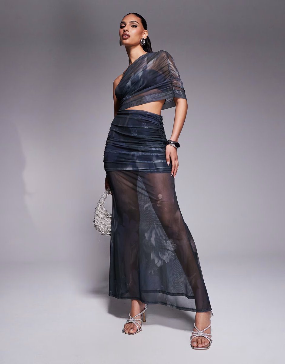Elegant and captivating, this one shoulder maxi dress features a ruched bodice and a sheer skirt in a blurred print. Perfect for evening events, this dress combines sophistication with a hint of mystery.