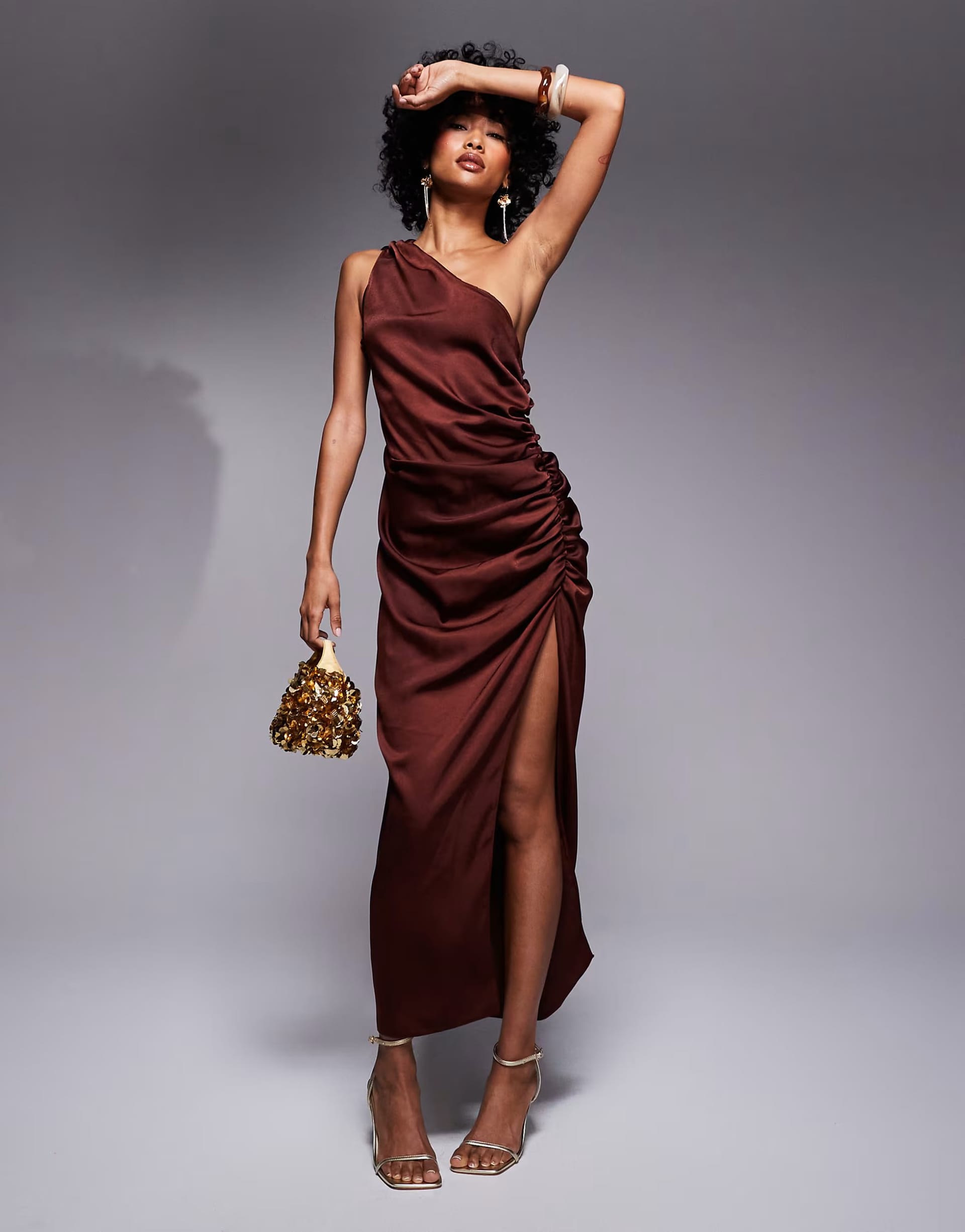 ASOS Chocolate Brown Satin One-Shoulder Midi Dress