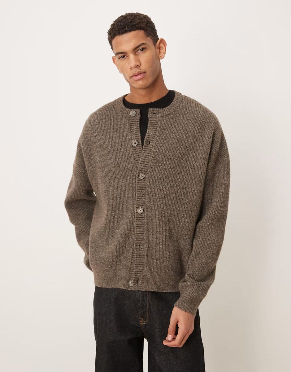 The ASOS DESIGN Brown Marl Fisherman Rib Crew Neck Cardigan is available in sizes XXXL, XXL, XL, XS, L, M, S.