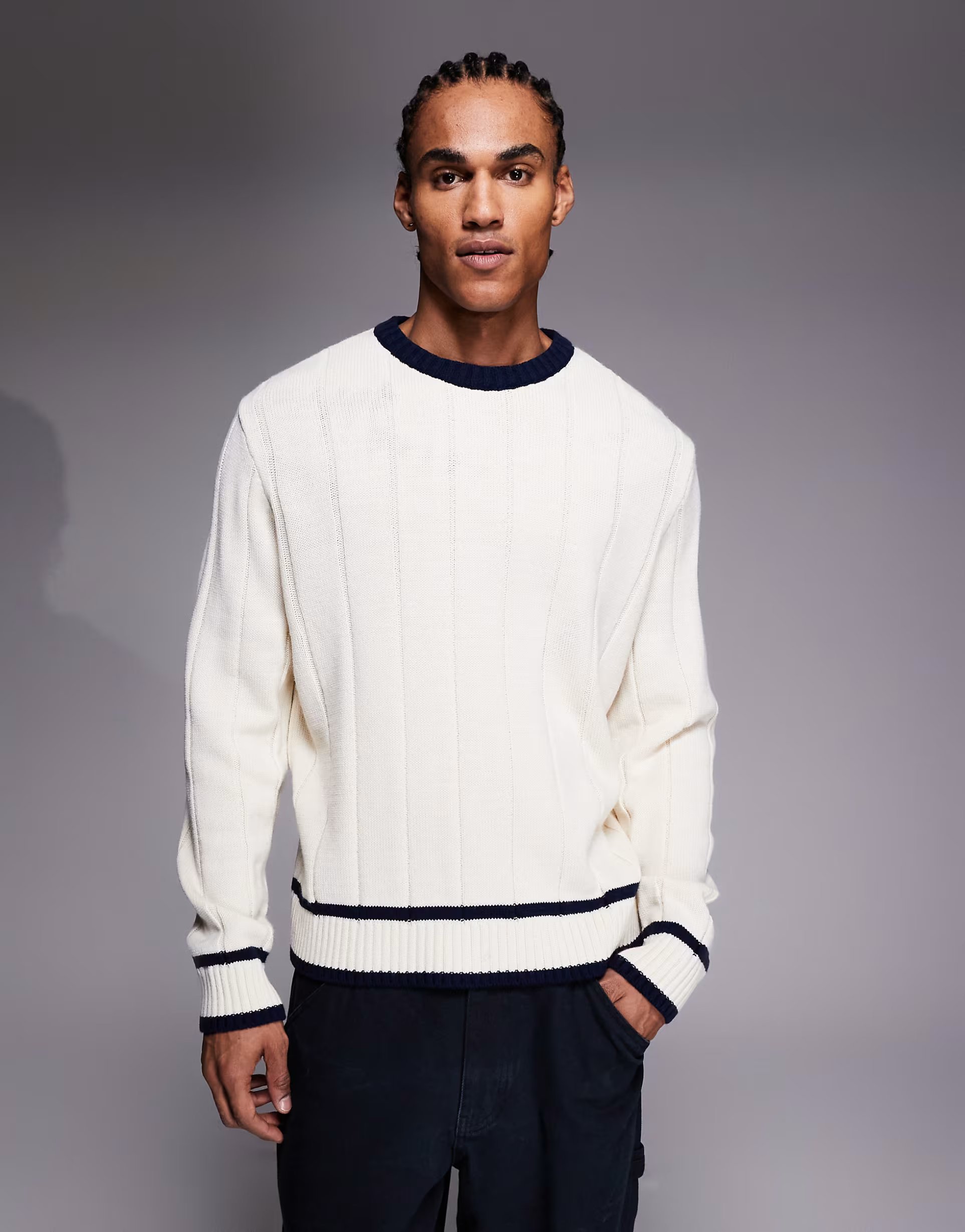 The ASOS oversized knitted wide ribbed with navy tipping jumper in Ecru is a stylish choice for a relaxed look. Featuring ribbed detailing and navy tipping, it combines comfort with a touch of sophistication.