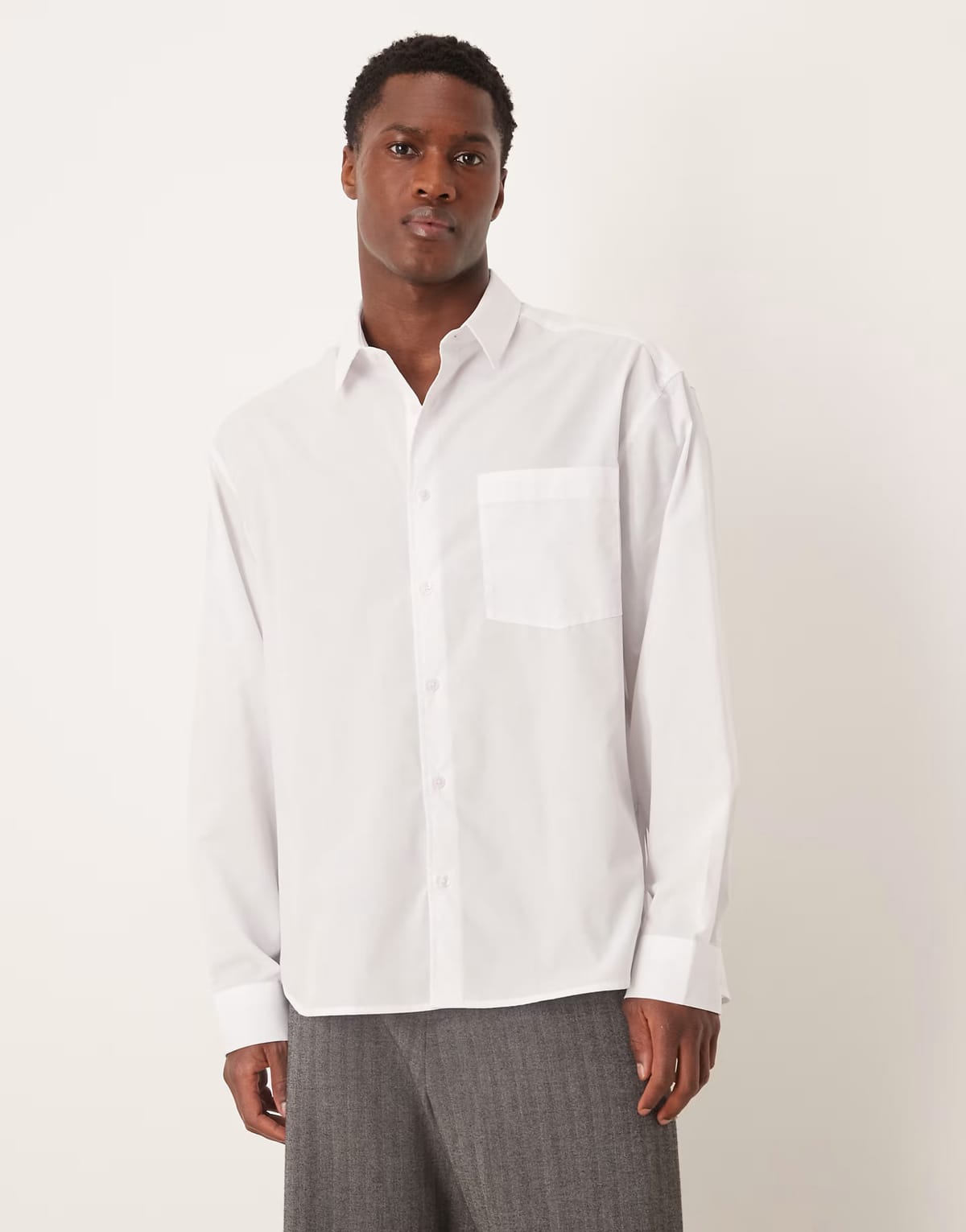 This oversized poplin shirt from ASOS DESIGN features a curved hem for a modern and relaxed look. The shirt is perfect for casual outings or layering under a blazer for a more polished appearance.